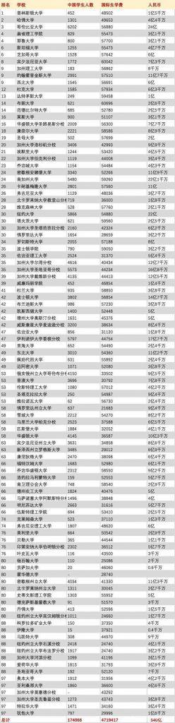 可以看出,前100的美国大学每年从17万余名中国学生身上赚到了约79亿美元的学费,即人民币约540亿元。这个数据和27万余名中国留学生为美国提供的每年1000多亿人民币的经济收入是大体相符的。