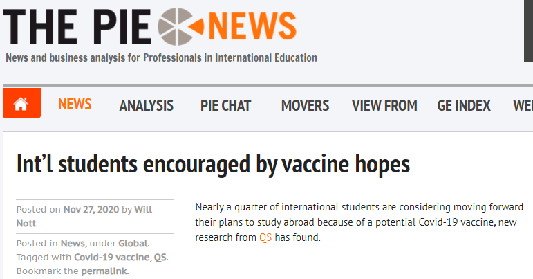 在各国疫苗研发取得可喜成果后,11月27日,为国际教育专业人士提供新闻和商业分析的英国Pie News发布了QS的最新调查研究。