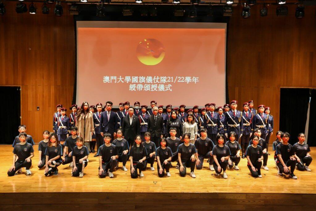 为嘉许表现优秀的澳门大学国旗仪仗队队员,澳门大学学生事务部举行绶带颁授仪式,向27名队员颁发高级绶带和肩章。