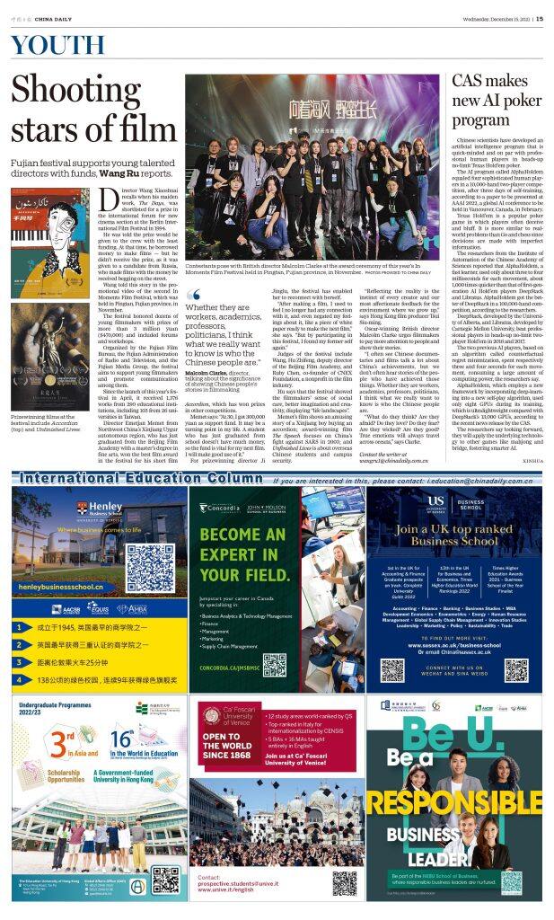 中国日报作为中国了解世界、世界了解中国的重要窗口,是国内外高端人士首选的中国英文媒体。在青年版(Youth)推出国际教育专栏(International Education Column),引进国内外知名高校,以及中外合作办学项目,致力让海内外学子了解第一时间的教育资讯。为支持留学提供便捷渠道。