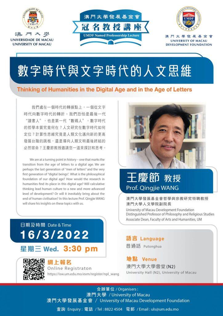 澳门大学将于3月16日(星期三)举办“澳门大学发展基金会冠名教授讲座”,由澳大发展基金会哲学与宗教研究特聘教授、人文学院副院长、哲学与宗教学系特聘教授王庆节以“数字时代与文字时代的人文思维”为题发表演说,探讨时代转变下的人文研究。