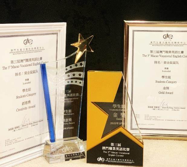 由澳门生产力暨科技转移中心主办的“第三届澳门职业英语比赛”评审结果近日揭晓,并于2022年3月举办颁奖礼。澳门科技大学酒店与旅游管理学院三年级学生吴子悦、林殷然、邓诗蔓及黄桢雅组成的队伍“黄金鼠鼠队”脱颖而出荣获学生组金奖及创意奖两大奖项。澳科大酒旅学生已连续两届取得学生组金奖的殊荣。