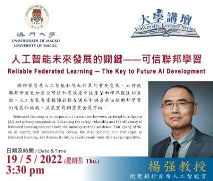 澳门大学将于5月19日(星期四)举办“大学讲坛”讲座,由微众银行首席人工智能官、香港科技大学计算机科学及工程学系讲座教授杨强担任讲者,就“人工智能未来发展的关键——可信联邦学习”为题发表演说,探讨人工智能的前沿技术和未来发展重点。