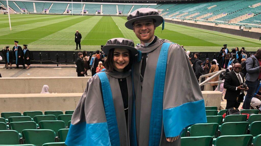 在伦敦特威克纳姆体育场举行的毕业典礼上,一对毕业于金斯顿大学的夫妇在热烈的掌声中双双获得博士学位。