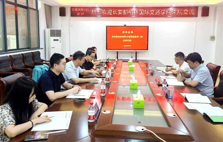 2022年8月3日下午,长安大学长安都柏林国际交通学院书记、院长汪海年一行6人来圣光机学院调研,圣光机学院副院长王坚、副书记张晓泉、办公室主任寿欣在学院111会议室接待了来宾。