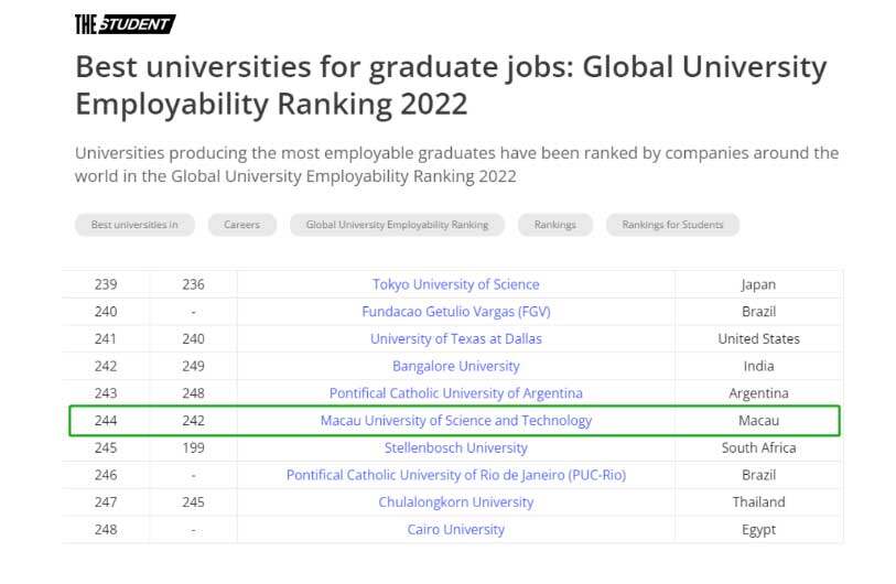 2022年11月23日,泰晤士高等教育(Times Higher Education,THE)发布了2022年度全球大学就业力排名 (Global University Employability Ranking 2022)。澳门科技大学在全球上榜的250所大学中位列244名,连续两年成为澳门地区唯一一所上榜该排名的大学。