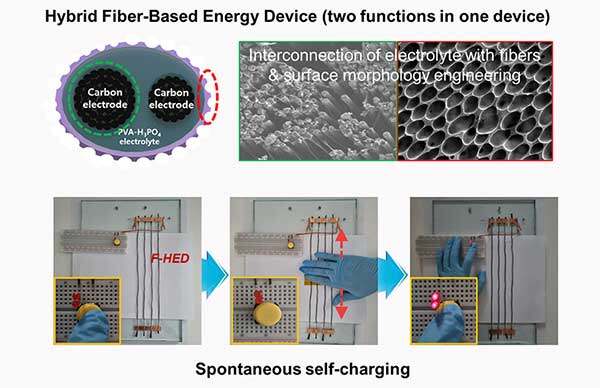 这篇基于赵栗在博士主持的中国国家自然科学基金(NSFC)项目的论文提出了一种独特的器件结构,能实现可穿戴器件中的自发自充电机制。尽管自充电的概念已经被提出,但大多数自充电设备需要在两个器件中分别进行发电和充电。在课题组的这项研究工作中,一个器件就能够实现自充电机制中的两个功能。研究还引入了一种无模板且可扩展的方法,能精准调控可穿戴器件的关键参数。这一方法提升了器件的电化学行为以及能量收集性能,在纤维尺度上增强了自发自充电(如下图)。
