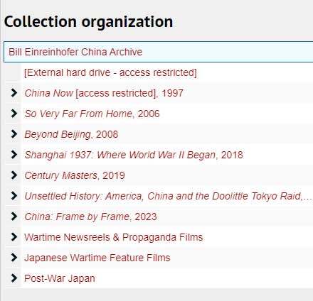 Einreinhofer将这些收藏整理成十个数字文件夹,对应着十个系列。其中七个系列来源于Einreinhofer制作的特别电视节目:《今日中国》(1997)、《远离家乡》(2006)、《北京之外》(2008)、《上海1937:第二次世界大战开始的地方》(2018)和《百年巨匠》(2019)等。