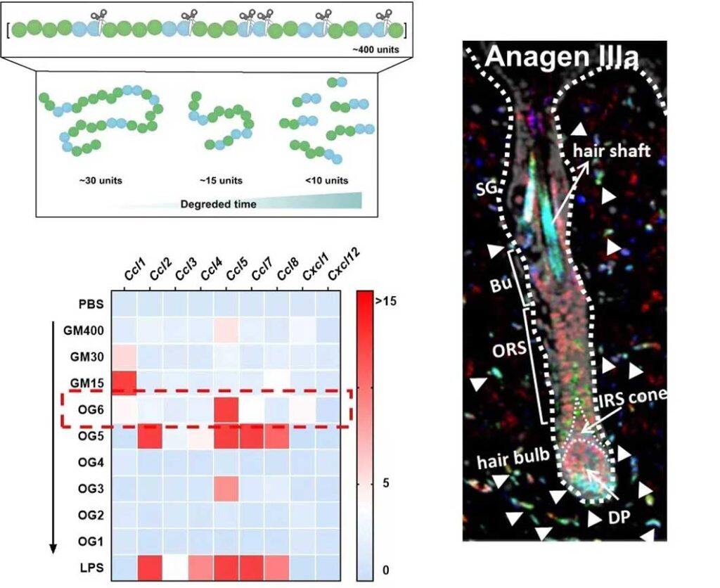 王春明表示,哺乳动物的毛发从毛囊中长出,其生长具有周期性,从静止期到生长期的转变受局部组织的生理微环境调控。毛囊附近某类免疫细胞数量或某类细胞因子浓度的变化,都可能刺激毛囊生长,但这些变化难以精准控制。在该研究中,团队优选出一种“纤维素酶”,如同剪刀一般,可将天然药物蒟蒻来源的葡甘聚糖,从非常大的分子“剪”成比较小的分子片段。从一系列比较小的片段中,研究人员找到一个代号为OG6的寡糖组分,可以精确诱导皮肤中的特定细胞释放一种名为“趋化因子”的信号(CCL5)。