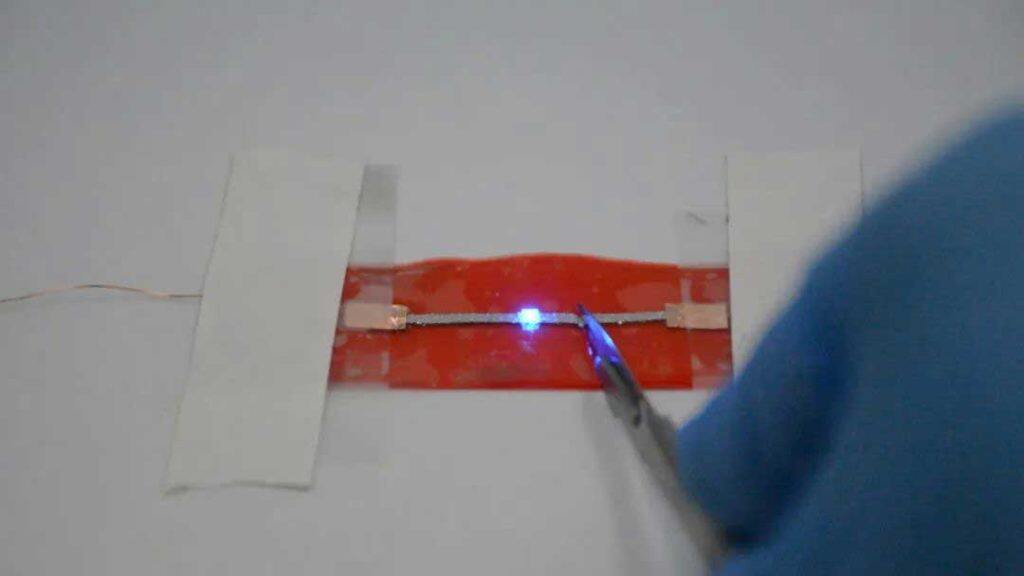 第二层是一种包含液态金属微粒的复合材料——能在破损后实现自我修复。当出现裂缝或撕裂时,从微粒中流出的液态金属可以流入缺口,使该材料几乎在瞬间便完成了自我修复,从而确保其高导电性。