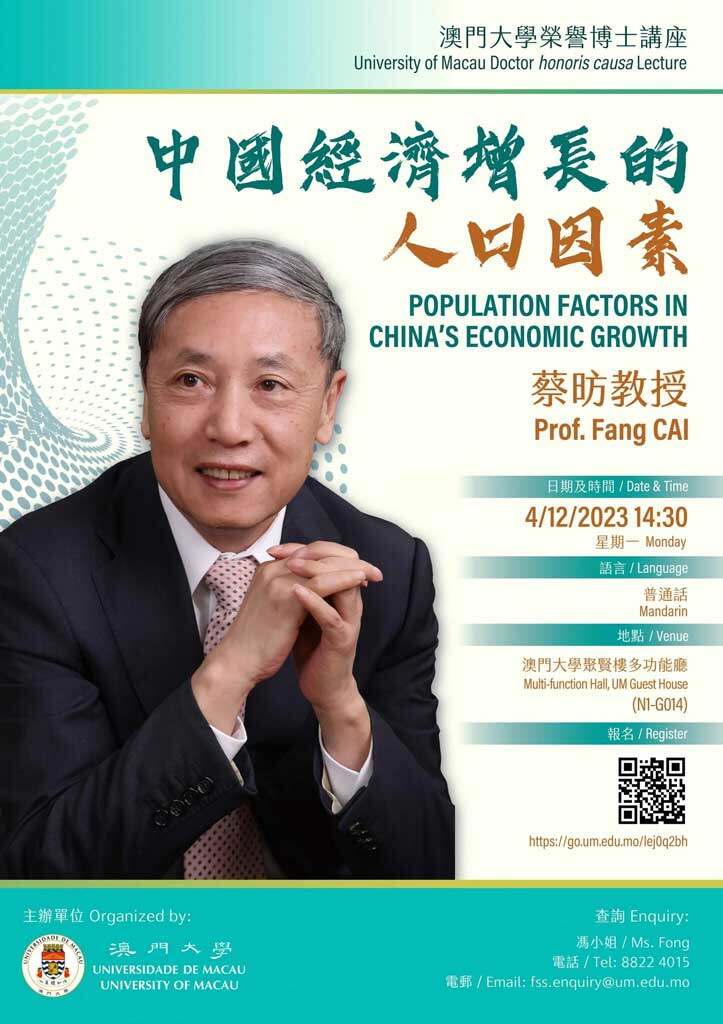 澳门大学荣誉博士蔡昉将于12月4日(星期一)以“中国经济增长的人口因素”为题在澳大发表演讲,从中国内地供给侧和需求侧揭示人口负增长时代的挑战与新机遇,进而从宏观及微观层面提出政策建议。欢迎有兴趣人士参加。