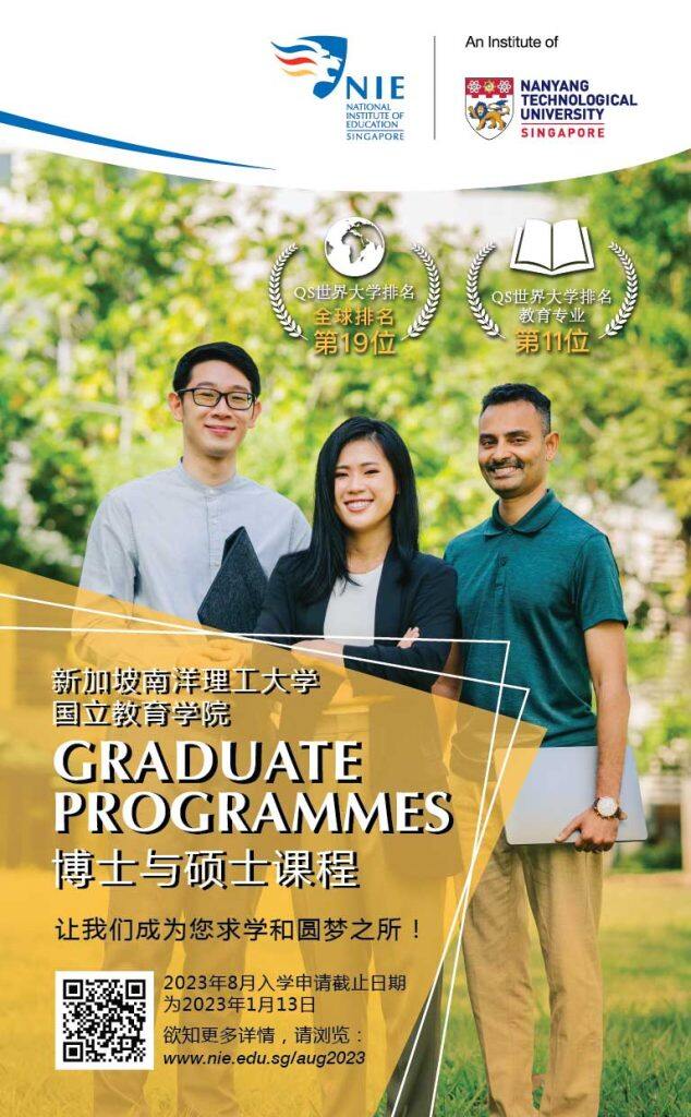 新加坡南洋理工大学国立教育学院(NIE)2023年8月份开学的博士与硕士课程现已开放报名,申请截止日期是2023年1月13日。有兴趣报读该学院的同学们,请前往以下官网链接或二维码了解更多信息。