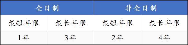 该课程提供全日制和非全日制两种研修方式,最短和最长毕业期限如下表所示: