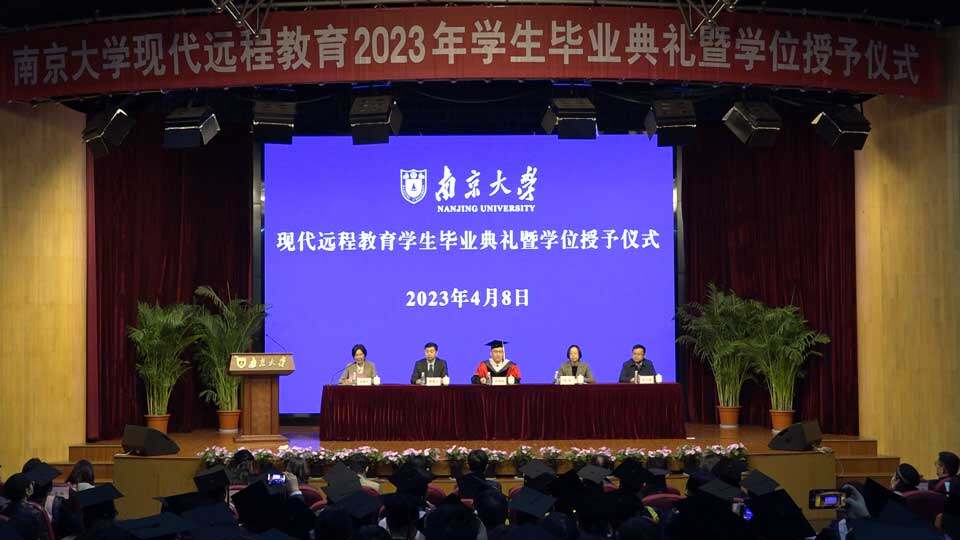 2023年4月8日,南京大学现代远程教育2023年学生毕业典礼暨学位授予仪式在南京大学鼓楼校区举行。南京大学党委常委、副校长张峻峰,本科生院、终身教育学院及现代远程教育专业负责人、教师代表,部分校外学习中心老师等出席了本次典礼。典礼由终身教育学院副院长储惠芸主持。