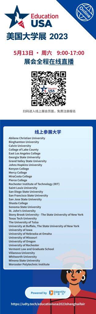 5月13日(周六),EducationUSA 2023美国大学展将在上海举办,欢迎感兴趣的同学、家长、老师和朋友们参加!