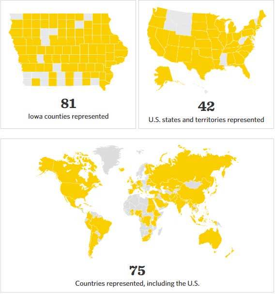 毕业生来自爱荷华州81个县、全美42个州以及世界75个国家。