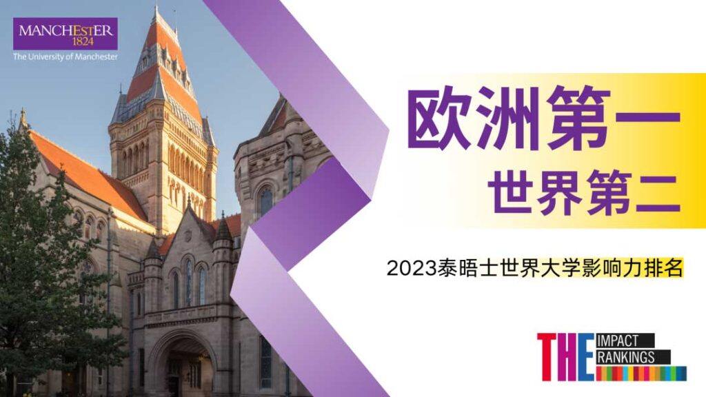 2023年6月1日,泰晤士高等教育(Times Higher Education)发布了2023年度世界大学影响力排名(THE Impact Rankings 2023)。曼彻斯特大学从来自115个国家的1705所大学中脱颖而出,世界大学影响力位列英国第一、欧洲第一以及全球第二名。曼彻斯特大学还是全球前十名中唯一入榜的英国高校,并且是自该排名创立以来,每年都进入世界前十的唯一大学。