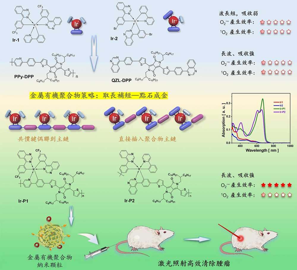 研究团队把筛选出的铱配合物与半导体高分子材料经过合理的分子裁剪和组装,成功开发了高效的光敏药物,既能保持铱配合物的I型光化学,又充分利用半导体高分子在长波段强吸收的优势。透过铱原子的点缀,半导体高分子产生活性氧的效率比原来提高了80倍。更重要的是,该策略普适性强,已成功拓展到一系列光敏药物的开发。