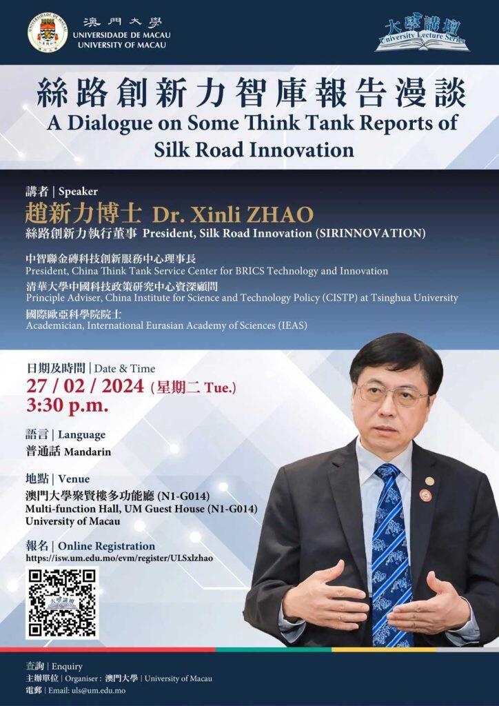 澳门大学将于2月27日(星期二)举办“大学讲坛”,邀请丝路创新力执行董事、国际欧亚科学院院士赵新力以“丝路创新力智库报告漫谈”为题发表演说,对“一带一路”的发展进行分析、评价和展望。欢迎有兴趣人士参加。