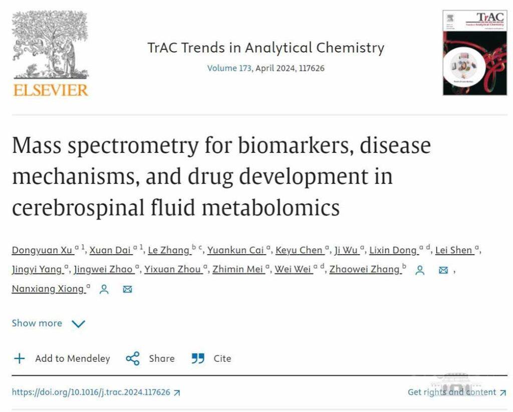 近日,武汉大学第二临床学院研究生徐东源以第一作者在《Trends in Analytical Chemistry》上发表题为Mass spectrometry for biomarkers, disease mechanisms, and drug development in cerebrospinal fluid metabolomics的论文,武汉大学中南医院神经外科戴璇博士为共同第一作者,武汉大学中南医院神经外科熊南翔教授和武汉纺织大学生物工程与健康学院张兆威教授为共同通讯作者。