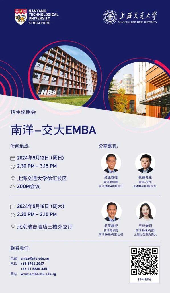 为了帮助大家全面了解中文EMBA 项目(以下简称南洋-交大EMBA),我们将于2024年5月12日(星期日)和5月18日(星期六)分别在上海和北京举办两场招生说明会,诚邀大家参加!