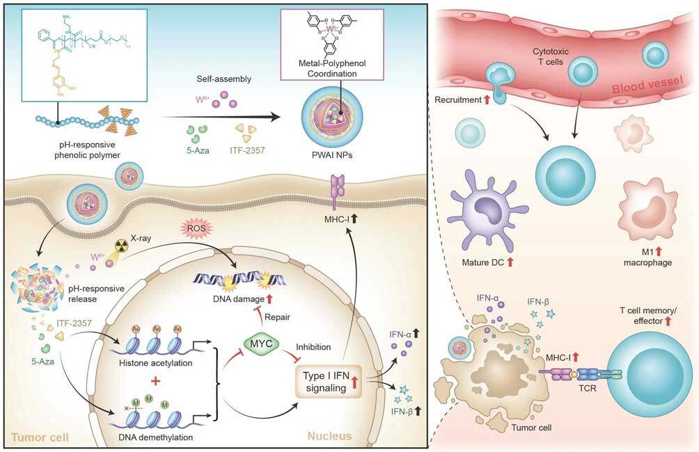 研究团队设计了一种新型纳米放射增敏剂(PWAI),目的是引发放疗中的双表观遗传学重编程。在PWAI合成过程中,两亲性PEG-多酚聚合物能与放疗增敏剂(钨离子,W6+)通过金属-多酚配位的方法自组装成核壳结构,并将5-Aza(DNA甲基转移酶抑制剂)和ITF-2357(组蛋白去乙酰化酶抑制剂)负载到疏水核中。
