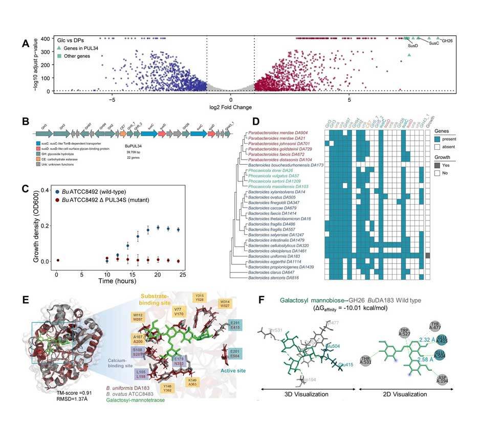研究团队系统地绘制了28种人体肠道拟杆菌和副拟杆菌利用20种中药多糖的生长表型的图谱,发现肠道拟杆菌之间和中药多糖之间存在显著生长差异。其中,铁皮石斛多糖(一种葡甘聚糖)能特别促进单形拟杆菌(B. uniformis DA183)的生长。为了揭示石斛多糖选择性促进单形拟杆菌生长背后的遗传机制,该研究进行了比较转录组分析和基因敲除实验。结果表明,多糖利用基因簇PUL34和关键酶GH26_BuDA183对于单形拟杆菌DA183菌株利用石斛多糖至关重要。透过序列比对分析,发现只有单形拟杆菌DA183的基因组能编码完整的PUL34_BuDA183基因簇。