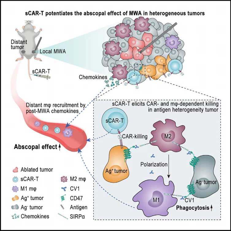 针对这一难题,研究团队设计并构建了可分泌SIRPα(CV1)的sCAR-T细胞。该新型CAR-T细胞不仅具有高亲和力,还能特异性阻断肝癌中限制巨噬细胞吞噬功能的“别吃我”(CD47-SIRPα)信号通路。研究表明,在联合微波消融治疗时,sCAR-T细胞可显著增强对远隔抗原异质性肿瘤的杀伤作用。而sCAR-T细胞在靶向杀伤肿瘤的同时,其分泌的CV1可阻断CD47-SIRPα通路,激发浸润巨噬细胞的抗肿瘤活性,进而杀伤抗原阴性或低水平表达的肝癌细胞。在包含肝癌在内的多种临床前动物模型中,使用sCAR-T细胞治疗可显著增强微波消融诱导的局部和远隔抗肿瘤免疫效应,有效抑制术后肿瘤复发及转移。该研究结果为肝癌患者提供了全新的综合治疗方案,极具临床应用潜力。此项研究成果展现了为未来肿瘤免疫治疗的研究与应用开拓了新的方向。