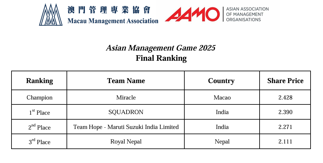 作为GMC澳门区冠军队伍,Miracle团队以其优异的商业分析能力和团队协作精神,将在GMC赛事中积累的宝贵经验和战略思维运用到本次亚洲挑战赛中。面对全新的市场环境和更强劲的对手,团队成员们沉着应战,快速分析历史资料,精准制定市场、生产、人事及财务等方面的决策,最终凭借出色的综合表现,成功问鼎冠军宝座。